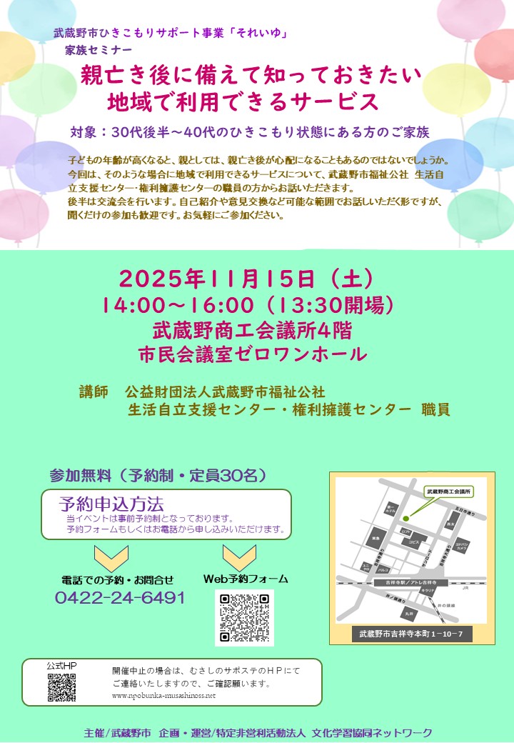 11月16日(土) 家族セミナー 武蔵野市立かたらいの道 市民スペース