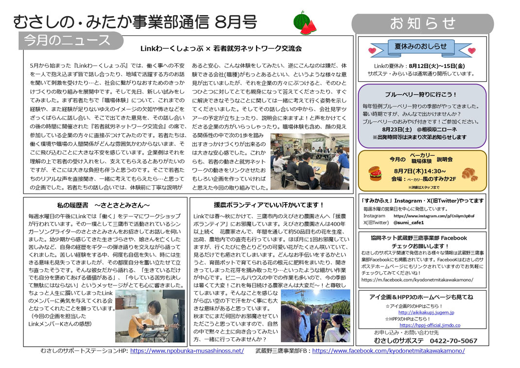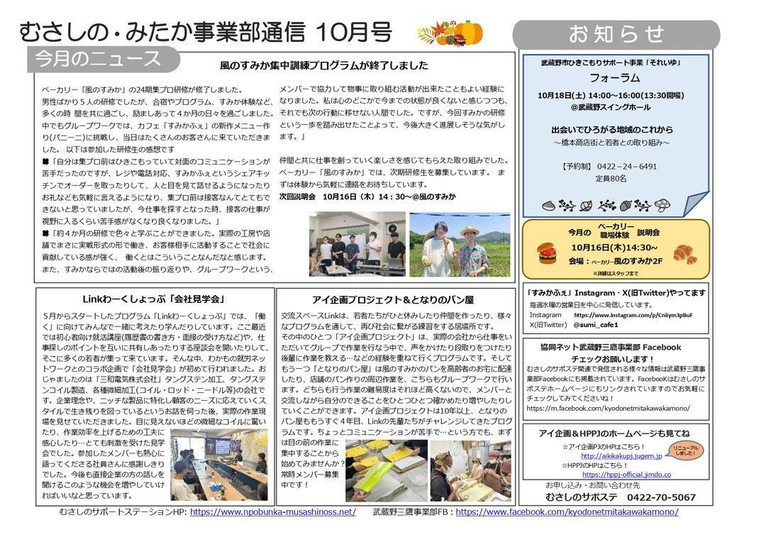 ※『スタディルーム』『PC教室(月曜日午後実施)』『デッサン倶楽部』や『援農プログラム』『フットサル』『みらいるキッチン』等のプログラムをサポステ奥『みらいる』にて実施しております。ご興味のある方は、サポステをご利用中の方も参加可能ですので、サポステスタッフまでお声かけください。