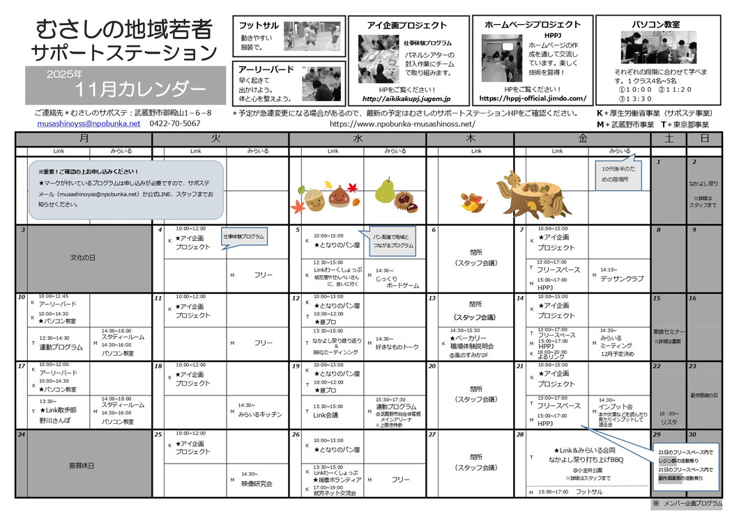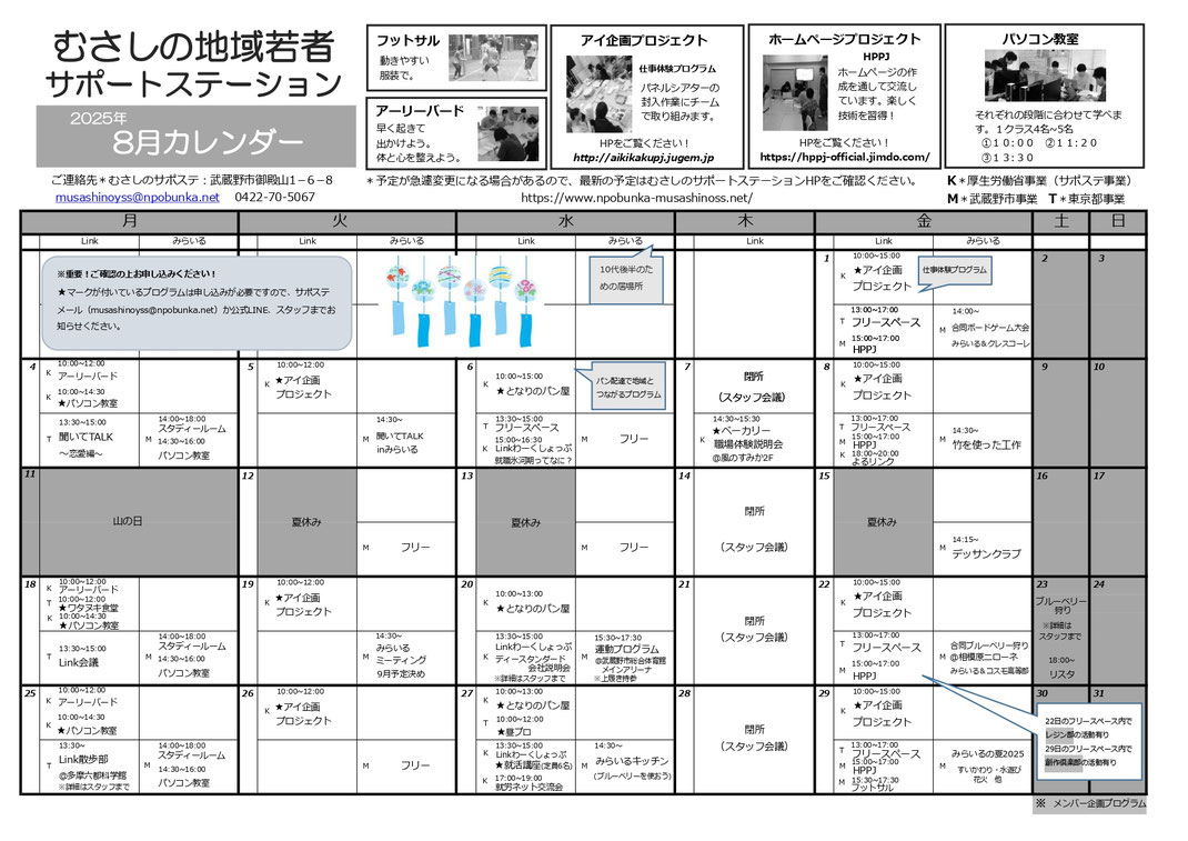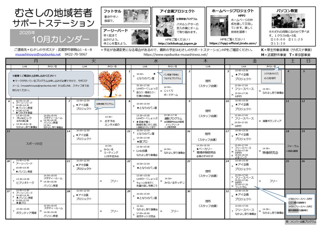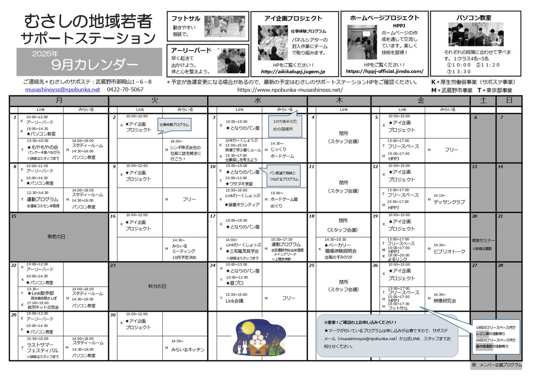 但し、カレンダーに★印の付いているプログラムに関しては申込が必要となりますので、サポステメール(musashinoyss@npobunka.net)や公式LINE、お電話(0422-70-5067)若しくはお近くのスタッフまでお知らせください。