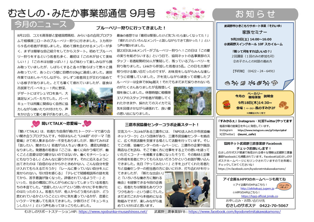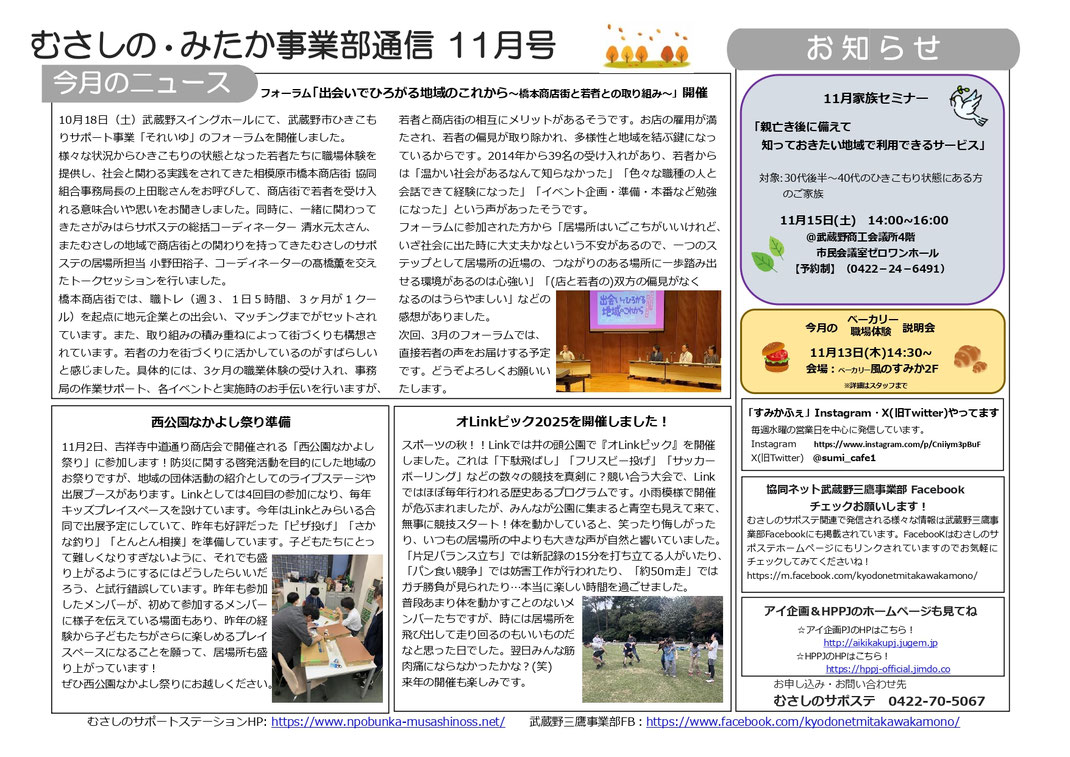 但し、カレンダーに★印の付いているプログラムに関しては申込が必要となりますので、サポステメール(musashinoyss@npobunka.net)や公式LINE(@966cmeew)、お電話(0422-70-5067)若しくはお近くのスタッフまでお知らせください。